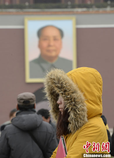 1月6日,北京出现降温迹象,天空开始落下零星小雪,参观天安门的游客将自己包裹地严严实实。中新社发 侯宇 摄
