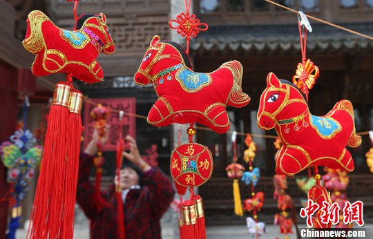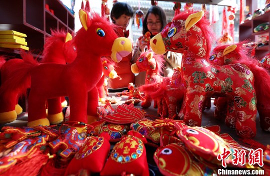 1月6日,市民在南京城南门东老街上选购马年生肖玩偶。随着中国农历马年的到来,“马到成功”、“龙马精神”等“马上体”日渐走红,各种造型的马因为被赋予好彩头而备受市民青睐。中新社发 泱波 摄