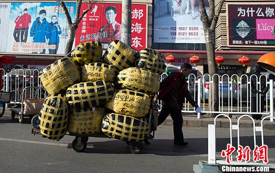 1月8日,大红门批发市场的工作人员搬运着大量货物。中新社发 张浩 摄