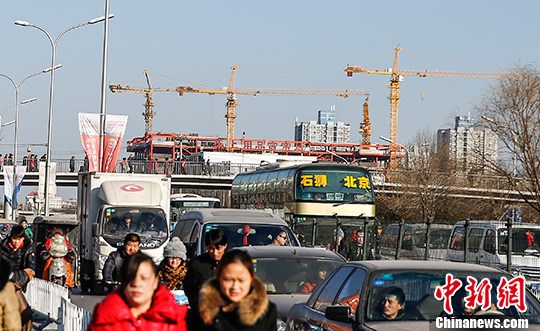 1月8日,大红门批发市场旁边交通拥挤,一辆福建石狮直达北京的长途客车驶过。中新社发 张浩 摄