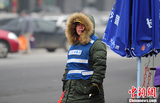 1月8日,恰逢农历腊八节,长沙街头一位穿着厚实的交通协管员正在指挥交通。当日,受较强冷空气继续影响,中国18省迎来大幅降温,中东部大部地区气温将下降4至8℃,局地降温可达10至12℃。中新社发 杨华峰 摄