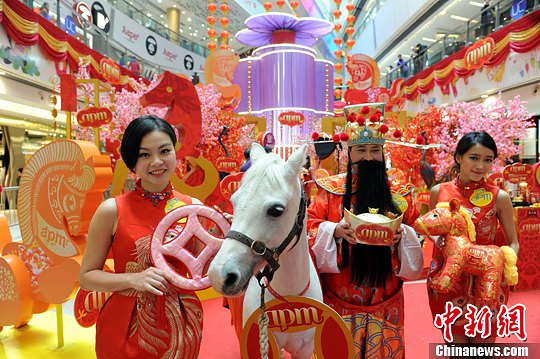 为迎接农历新年来临,香港apm商场呈献“骏马跃动华丽园”推广活动,打造全港首个逾6000平方呎艺术喜庆兼备的骏马华丽园,为巿民带来一个喜气洋洋的马年。1月8日,财神爷与女郎等率先行登场,营造气氛。中新社发 谭达明 摄