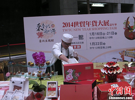 农历新年将近,1月9日下午台北市举办2014“来台北过好年”活动揭幕记者会,推出“台北年货大街”、“台北新春购物月”、“世贸年货大展台北年货主题馆”三大主题活动,让台北处处充满浓郁年味。图为大厨在活动现场布置年货大展展台。中新社发 叶小刚 摄