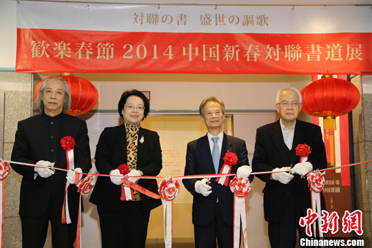 1月14日,由文化部主办,中国美术馆和日中友好会馆承办的2014“欢乐春节”迎新楹联书法展在日本东京日中友好会馆举行了开幕式。驻日使馆文化参赞何静、日本参议院议员、日中友好会馆会长江田五月出席了开幕会并为开幕式剪了彩。中新社发 高越 摄
