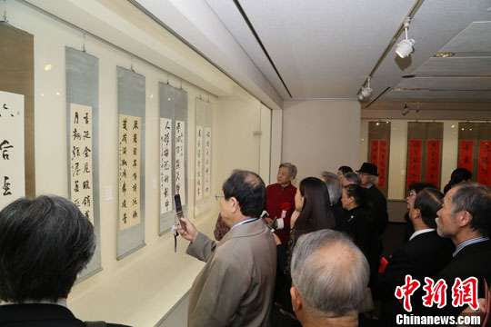 1月14日,由文化部主办,中国美术馆和日中友好会馆承办的2014“欢乐春节”迎新楹联书法展在日本东京日中友好会馆举行了开幕式。中新社发 高越 摄
