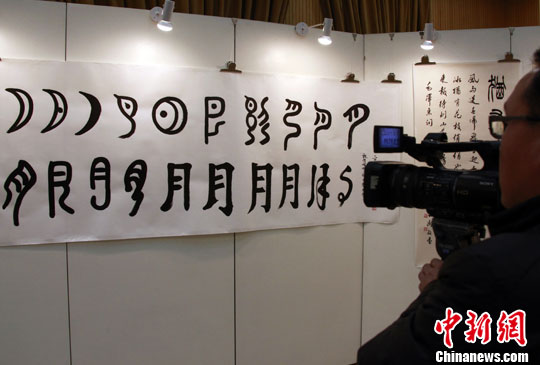 1月17日,艺术名家为中国探月工程成就展创作的不同字体“月”字书法作品展示时受媒体关注。中新社发 孙自法 摄