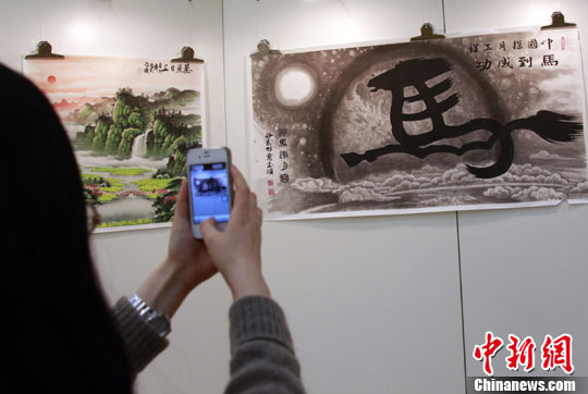 1月17日,马年春节前夕,艺术名家为中国探月工程成就展创作的“马到成功”书画作品颇受观众瞩目。中新社发 孙自法 摄