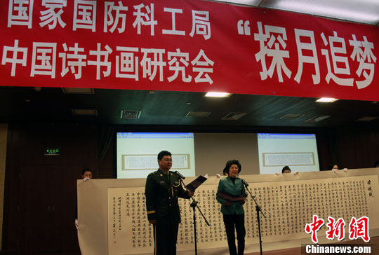 1月17日,中国诗书画研究会副会长、原新闻出版总署副署长李东东朗诵她创作并由书法家卢中南挥毫的词赋作品《嫦娥赋》,助兴探月追梦。中新社发 孙自法 摄