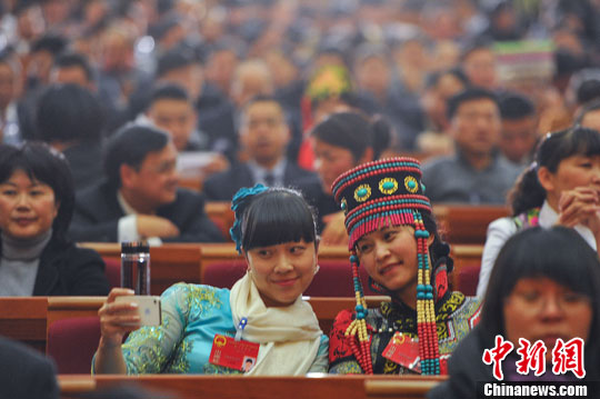 1月20日,云南省第十二届人民代表大会第二次会议在昆明开幕,来自全省各地的少数民族代表争相用手机、平板电脑、相机记录会场瞬间。中新社发 任东 摄