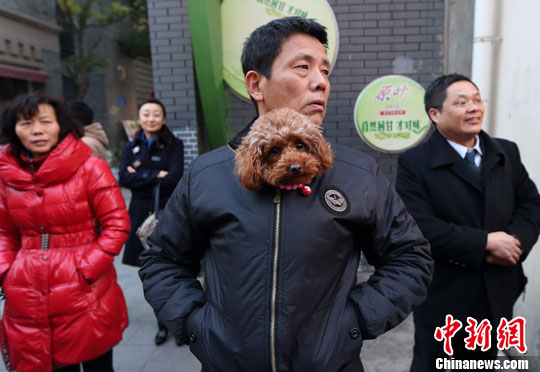 1月20日,南京气温很低,一名遛狗的男子将狗狗紧紧裹在自己的衣服内抵御寒风,此举虽夸张倒也管用,一路行走在街头,狗狗的萌样吸引了不少目光。中新社发 泱波 摄