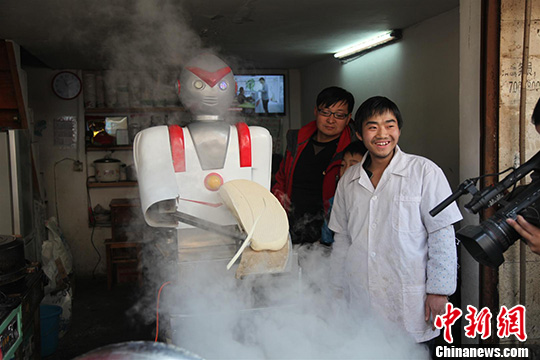 在湖北宜昌市一家名为“机器人刀削面馆”的小店,门口摆放的一台“奥特曼”机器人削面机甚是醒目,手起刀落,双目闪闪发光,10秒钟便可削一碗面。冲着这个新家伙,不少市民慕名前来品尝,生意火爆。顾客称,机器人削的面“粗细厚薄都很均匀,吃起来很不错。”