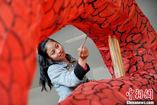 1月20日,在江西省德兴市新岗山镇占才村,村民们刚刚赶制好板凳灯龙头后,就喜不自禁地抬出来拼接成型,现场抬灯演示。卓忠伟 摄