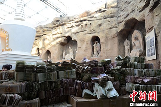 在佛教艺术展厅内,共51096元人民币的善款多数由捆扎好的一角、五角和一元纸币组成,还有少量的五元、十元、二十元。 位于甘肃庆阳境内黄土高原沟壑深处的北石窟寺具有1500多年历史,经历千百年的“风吹日晒”后急需修缮保护。