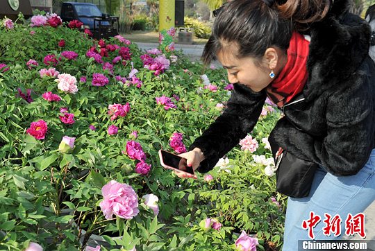 1月21日,2014年春节牡丹风情节在广州华南植物园进行预展,吸引游客驻足拍照。据悉,此次牡丹风情节汇集九大色系、六大花型,共80个品种一万余株,牡丹风情节将在春节期间喜迎八方来客。中新社发 刘卫勇 摄
