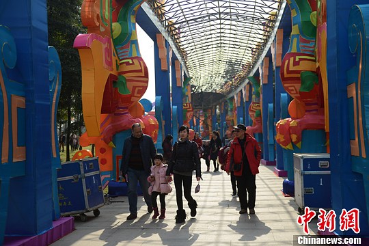 1月21日,成都金沙遗址博物馆内的灯组安置进入最后阶段,即将迎来28日的2014金沙太阳节到来。据介绍,此次太阳节园区内共有70组灯组,共使用了2000串LED串灯用于氛围营造,为历届太阳节之最。作为成都春节期间三大群众文化活动,此届金沙太阳节在保留以往绚丽彩灯、各地美食、精彩演艺的基础上,还增加了异域风情和时尚元素。