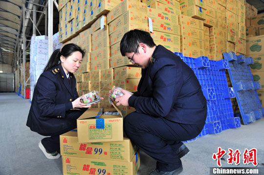 1月21日,厦门出入境检验检疫局大嶝办事处的工作人员正在对台湾进口食品进行检查。中新社发 吕明 摄