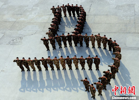 1月22日,福建边防总队训练基地首次离家在警营过节的“90”后新兵,别出心裁组成“马”字图案贺新春。中新社发 刘可耕 摄