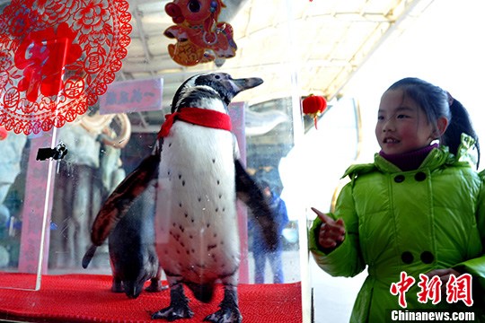 1月22日,两只在合肥诞生的企鹅首次现身户外向游客拜年。据介绍,这两只企鹅是2012年在合肥海洋馆里孵化的,经过一年多的人工饲养和培训,已经能够适应合肥地区的冬季户外气温。中新社发 韩苏原 摄