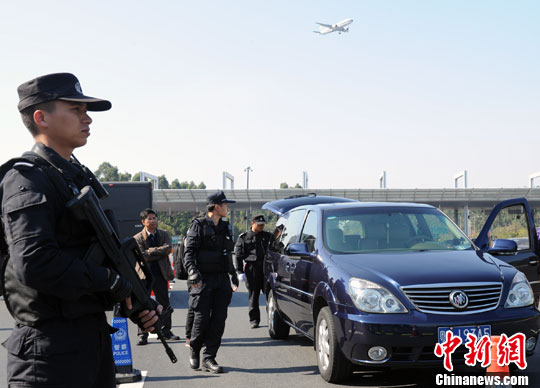 1月22日,广州白云机场特警队在机场周边的道路上设关卡检查过往的车辆,确保春运期间白云机场的安全。中新社发 梁永强 摄