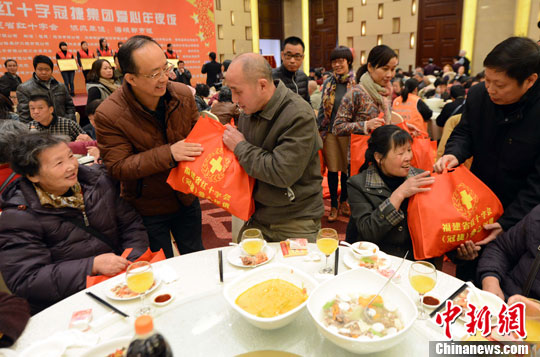 1月23日,正值中国农历小年,福建省红十字会举办2014年红十字爱心年夜饭活动,福州城区的1千名孤寡老人、孤儿等乡亲邻里共同品尝了一餐年夜饭并获得1份价值200余元的“爱心年货大礼包”。福建省红十字会党组书记、常务副会长黄毅敏表示,福建省红十字会已是连续第7年组织开展爱心年夜饭活动。随着越来越多的社会爱心单位和人士积极参与,活动规模一年比一年大,受益人数也一年比一年多。据介绍,福建省红十字会已连续16年在元旦、春节期间开展“红十字博爱送万家”活动,共筹集人道救助慰问物资价值5380多万元,受益群众19.2万户68万余人。