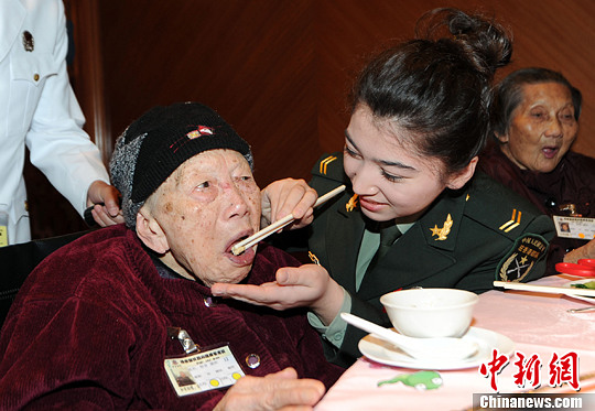 1月26日,中国人民解放军驻港部队30余名官兵前往新界,慰问香港博爱医院戴均护理安老院的老人。图为女兵热孜阿依喂老人用餐。中新社发 张宇 摄