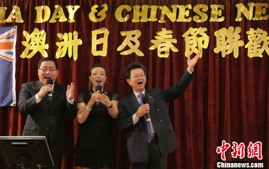 图为中国驻悉尼总领事李华新(左)、澳大利亚华协会主席吴昌茂(右)、悉尼歌唱家黄梅(中),共同高歌一曲,祝贺澳洲日和马年春节,祝澳中人民友谊万古长青。中新社发 朱大强 摄