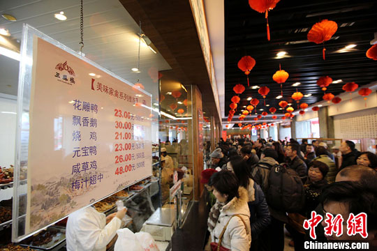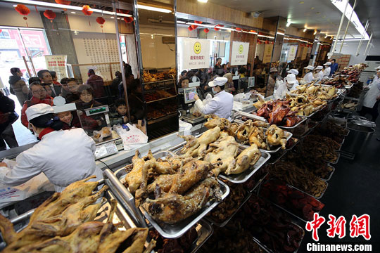 1月27日,市民在“中华老字号”无锡三凤桥肉庄排队选购熟食和卤菜。农历除夕将至,各种老字号熟食和浓郁地方特色的菜肴进入火爆销售期,江苏无锡市三凤桥肉庄以中华名菜三凤桥酱排骨为主的60多个品种特色熟食和卤菜系列,受到本地和周边地区苏州、上海南京等地消费者的欢迎,熟食卤菜的日销售量达20多吨。