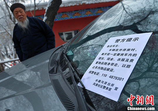 1月28日,新疆乌鲁木齐市风景社区工作人员与社区民警联合在该辖区清泉寺前的道路旁悬挂“警方提示”,并张贴在路边停靠的车辆上,提醒私家车主节日防盗。中新社发 刘新 摄