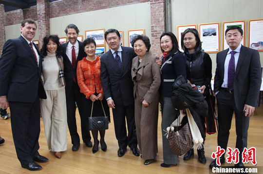 图为中国驻纽约副总领事张美芳、著名指挥家余隆、纽约爱乐乐团理事会主席Gary Parr等在新闻发布会后合影。中新社发 阮煜琳 摄