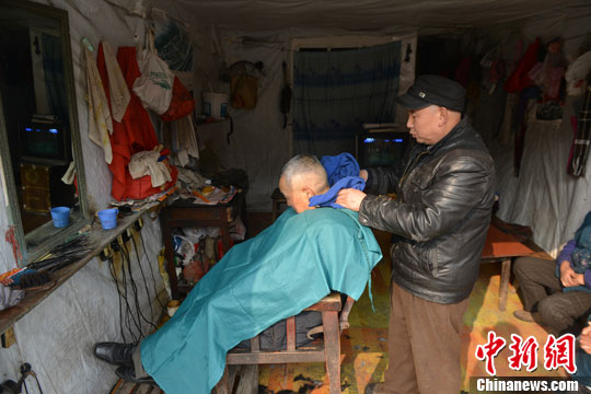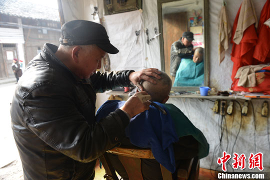 1月底,临近农历春节,四川雅安荥经县各理发店迎来理发高峰,以此期盼新年从“头”开始。图为一位老人在一间理发店理发。中新社发 张浪 摄