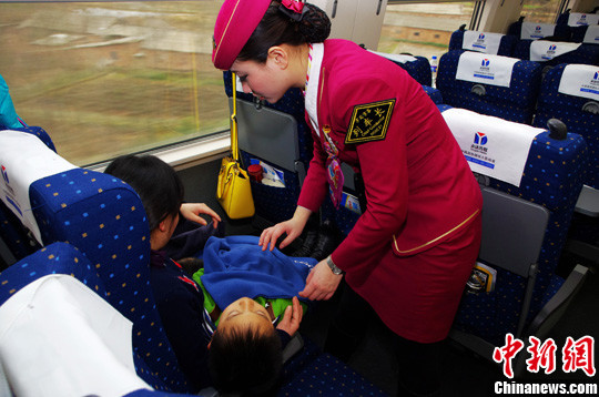 2月4日,北京铁路客运段G83次列车内,列车长高曼在巡查中为睡觉的小孩盖上毛毯。中新社发 贾天勇 摄