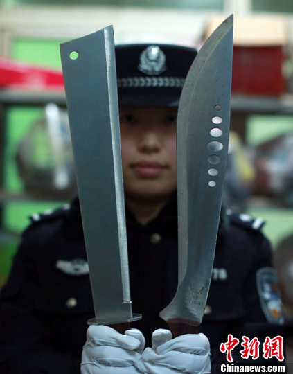 图为武汉铁路民警展示收缴的管制刀具。中新社发 赵军 摄