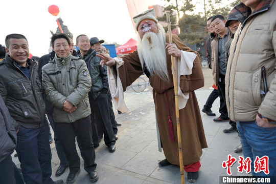 2月5日,呼和浩特文化庙会开幕,晋剧丑角在台下与路人互动。中新社发 刘文华 摄