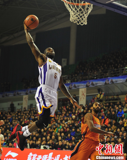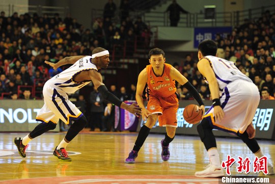 2月5日,2013-2014赛季CBA常规赛第29轮的比赛在辽宁本溪举行。最终,辽宁衡业主场(白)104:94战胜上海大鲨鱼(橙)。中新社发 于海洋 摄
