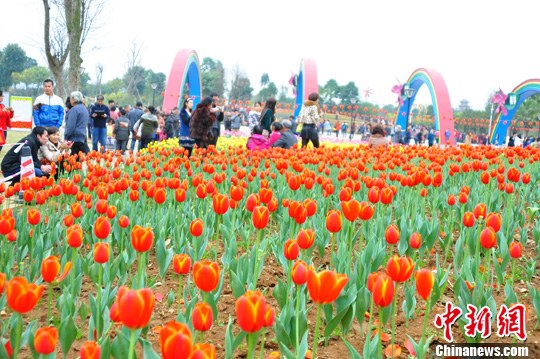 广西柳州园博园的20万株郁金香竞相开放,五彩缤纷花朵引来众多市民观赏、拍照。周潇男 摄