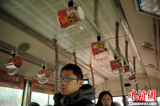 2月10日,重庆一公交车拉环上挂满了“桶装拉面”。据悉,商家为了产品的广告,利用公交车的扶手制作桶装拉面拉环,吸引乘客眼球,加深对该产品的印象。中新社发 陈超 摄