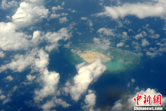 2月10日,在上海飞往新加坡的航班上俯瞰南海一处美丽的珊瑚岛礁,宛若碧海明珠。中新社发 孙自法 摄