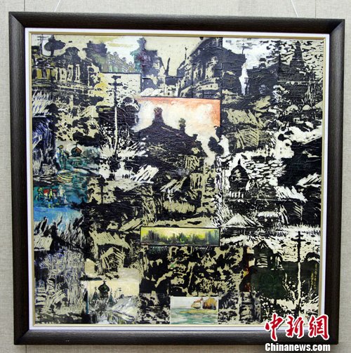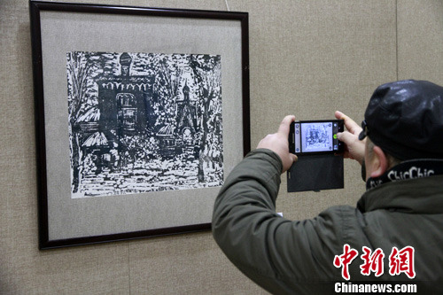 2月11日,70幅讲述老哈尔滨风情的冰版画在哈尔滨兆麟街123号展馆展出,图为一位参观者用手机拍照留念。冰版画是在一块厚度不等的冰版上雕刻图案,利用逐渐融化的冰块与颜料混合创作而成,因为冰块融化印出来的效果都有所不同,因此每张冰版画几乎都是“绝版”。