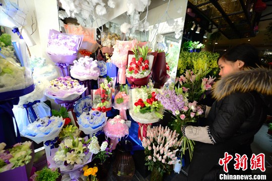 2月11日,正值情人节前夕,一位花店员工正忙着准备花卉,该花店的一支普通玫瑰花预定价已超过30元一朵。中新社发 杨华峰 摄