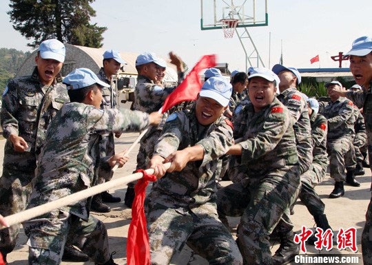 刚果(金)当地时间2月14日,正值中国传统节日元宵佳节,远在非洲大陆的中国第十六批赴刚维和工兵分队在繁重的任务之余,开展一系列活动欢度佳节。图为维和工兵进行拔河比赛。中新社发 李伟 摄