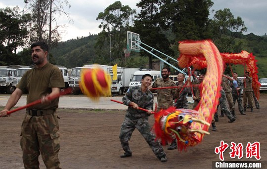 图为中国维和工兵同巴基斯坦维和部队官兵一起舞龙。中新社发 李伟 摄