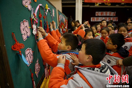 2月17日是无锡中小学生新学期开学的日子,无锡南长街小学的学生们在挂有中国结的纸片上写上本学期自己的“微心愿”,借喻“马上体”,祝愿自己马上有进步、马上跑步快等寄语,以示新学期启程。中新社发 李一芳 摄