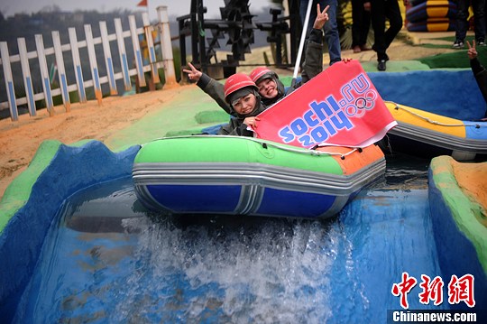 2月18日,重庆洋人街一游乐场聚集了不少外国友人体验寒冷漂流,同时举着“为冬奥运动健儿加油”标语。重庆洋人街众多外国友人和重庆市民穿着连体防水衣,在寒冷的天气里一同体验水上漂流,同时也为正在俄罗斯举行冬季奥运会的运动健儿们加油助威。