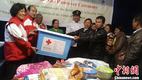 当地时间2月22日,中国红十字会与缅甸红十字会在缅甸克钦甘拜地正式签署人道主义物资移交文件,并现场移动交5000箱“家庭赈济箱”。中新社发 董子畅 摄