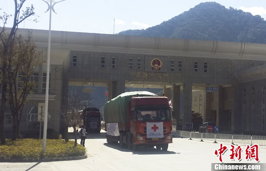 2月22日中午,中国红十字会援缅物资车队通过中国腾冲猴桥口岸,将援缅人道主义物资移交缅甸克钦甘拜地地区。中新社发 董子畅 摄
