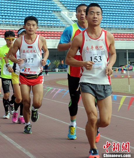 2月23日,来自厦门的28岁选手游培泉(前右)以141公里的成绩夺得2014福州12小时超级马拉松赛男子组冠军,破该赛事纪录。中新社发 刘可耕 摄