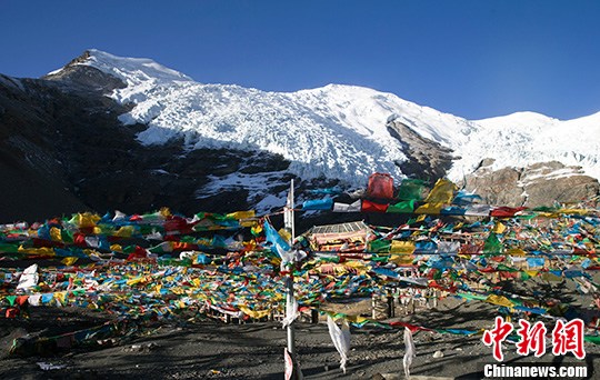 2月下旬,西藏自治区乃钦康桑雪山下飘满五颜六色的经幡,五彩经幡在西藏随处可见,常挂在山顶山口、江畔河边、道旁以及寺庙等各处被认为有灵气的地方。中新社发 张浩 摄