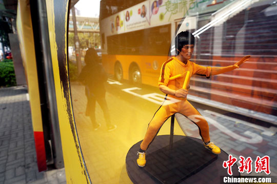 2月25日,设立在香港街头巴士站的李小龙立体模型别具特色,吸引路人注目。中新社发 洪少葵 摄