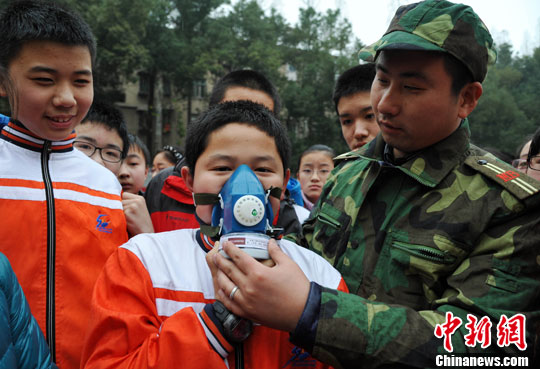 2月25日,民防志愿者为学生们演示防毒面具的佩戴方法。当日,来自合肥市人防办的应急专家为合肥市第五十中学师生讲解了民防应急、自救互救的知识,学生在民防志愿者的指导下模拟演练应急疏散。中新社发 韩苏原 摄