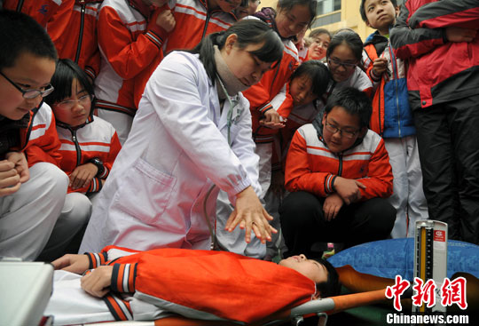 2月25日,民防志愿者为学生们演示胸外心脏按压急救的方法。中新社发 韩苏原 摄
